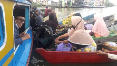 Martapura, kalselpos.com – Saat matahari mulai terbit, tampak sebuah kapal dikelilingi pedagang pasar terapung Lok Baintan Kecamatan Sungai Tabuk, Kabupaten Banjar, Minggu (11/10) pagi. Di dalamnya, ternyata ditumpangi kandidat Bupati Banjar, DR Andin Sofyanoor SH MH.