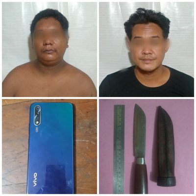 Selain mengamankan kedua pelaku, tim buser di bawah kendali Ipda Hendra Ginting juga menyita satu buah senjata tajam jenis pisau belati dan Hp (Handphone) merk VIVO type S1 warna biru.