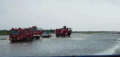 Saat ini sedang dilakukan upaya pembersihan dan penyedotan genangan air di landasan pacu dengan mengoperasikan 54 unit pompa.