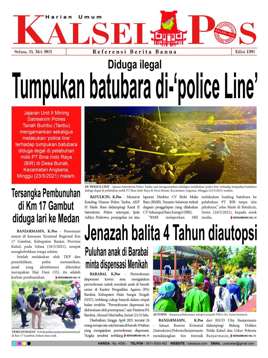 Diduga ilegal Tumpukan batubara di-‘police Line’ Epaper Kalselpos 1392 Edisi Selasa 25 Mei 2021