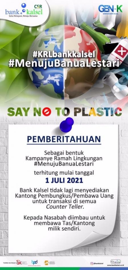Sebagai bentuk kepedulian terhadap pelestarian lingkungan dan tindaklanjut atas Rencana Aksi Keuangan Berkelanjutan (RAKB), melalui program CSRnya (Corporate Social Responsibility) Bank Kalsel meluncurkan program “Kampanye Ramah Lingkungan” yang dibungkus dalam hashtag