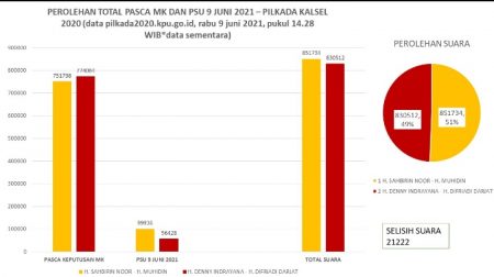 Banjarmasin, kalselpos.com – Paslon Gubernur Kalsel Nomor Urut 01 Sahbirin Noor – Muhidin untuk sementara masih unggul pada PSU 9 Juni 2021.