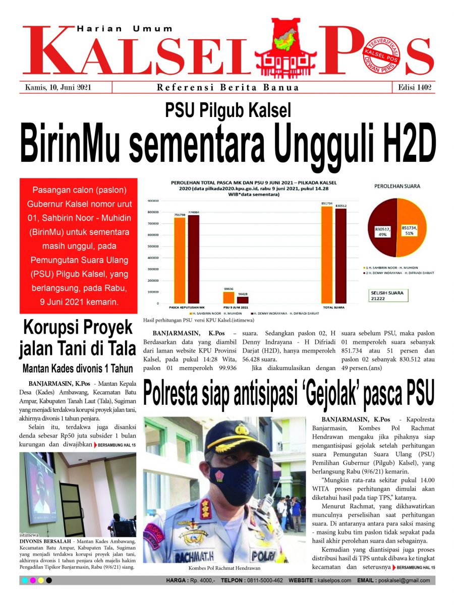 PSU Pilgub Kalsel BirinMu sementara Ungguli H2D. Epaper Kalselpos 1402 Edisi Kamis 10 Juni 2021