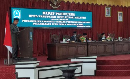 Kandangan, kalselpos.com– Bupati Hulu Sungai Selatan (HSS) Achmad Fikry jelaskan penggunaan dana Anggaran Pendapatan dan Belanja Daerah (APBD) 2020 kepada anggota DPRD, dalam rapat paripurna penyampaian Laporan Keterangan Pertanggungjawaban (LKPj), Selasa (15/6).