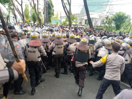 Banjarmasin, kalselpos.com – Aksi unjuk rasa (unras) ratusan mahasiswa yang tergabung dalam Badan Eksekutif Mahasiswa se Kalimantan Selatan (BEM SeKA), berujung aksi saling dorong dan bentrok dengan aparat keamanan, Kamis (23/6/21) siang.