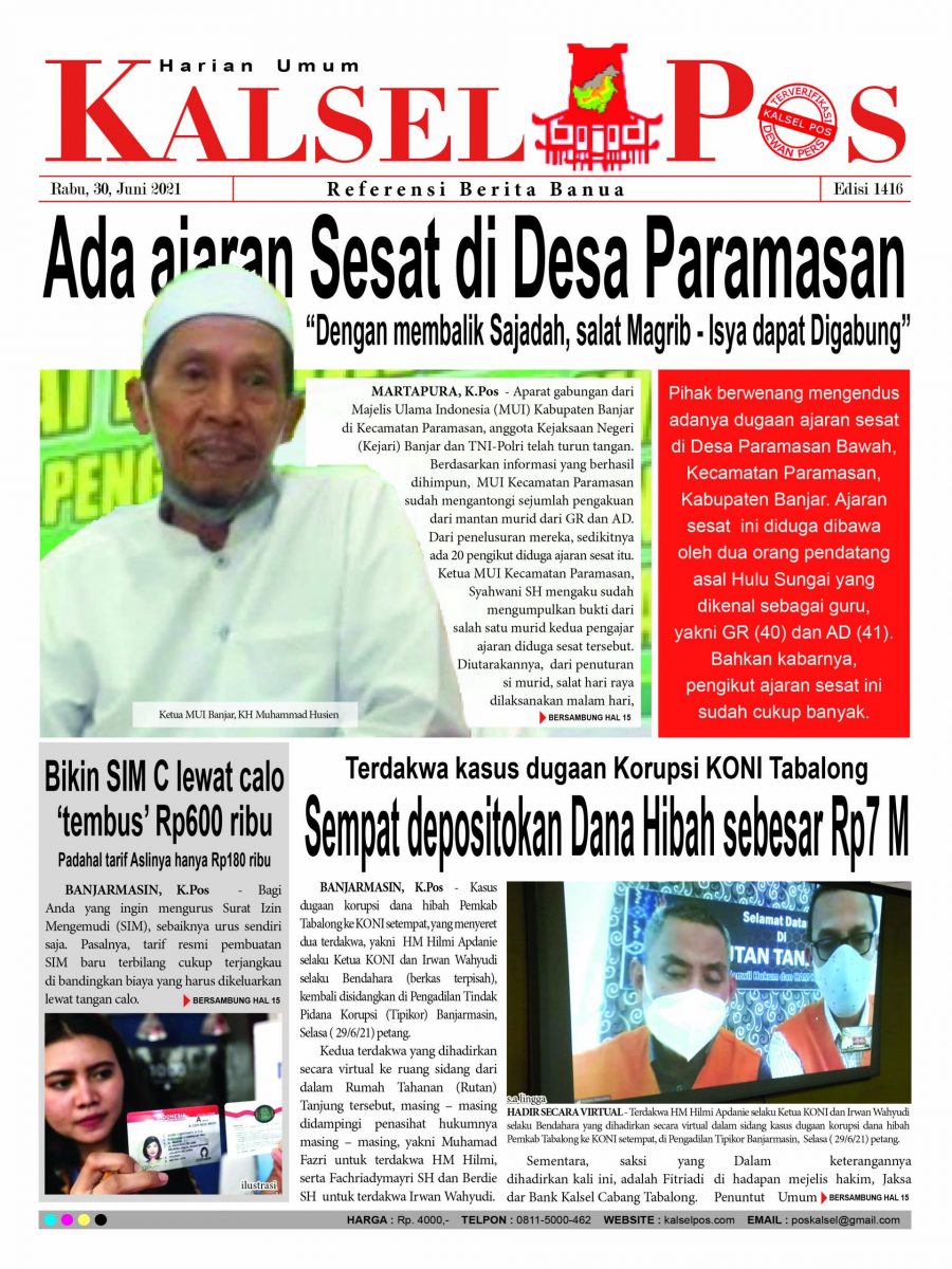 Ada ajaran Sesat di Desa Paramasan “Dengan membalik Sajadah, salat Magrib – Isya dapat Digabung”. Epaper Kalselpos 1416 Edisi Rabu 30 Juni 2021