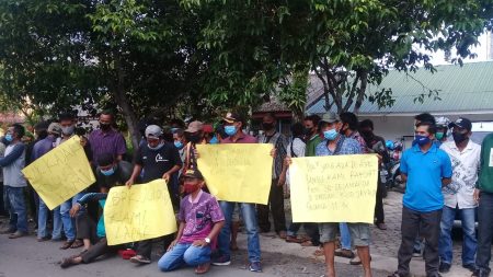 Marabahan, kalselpos.com – Puluhan petani plasma kelapa sawit dibawah naungan KUD Jaya Utama bermitra dengan PT. Agri Bumi Sentosa, melakukan unjuk rasa di depan kantor Kejaksaan Negeri Barito Kuala, Kalimantan Selatan, Aenin (12/ 07).