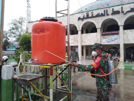 Tanjung, kalselpos.com– Memperingati HUT ke-63 Kodam VI/Mulawarman sekaligus dalam rangka membantu pemerintah dalam penangan wabah covid-19, Kodim 1008/Tabalong melaksanakan penyemprotan disinfektan di Masjid Ash-Shirathal Mustaqim, Kecamatan Tanjung, Kabupaten Tabalong. Kamis (15/7).