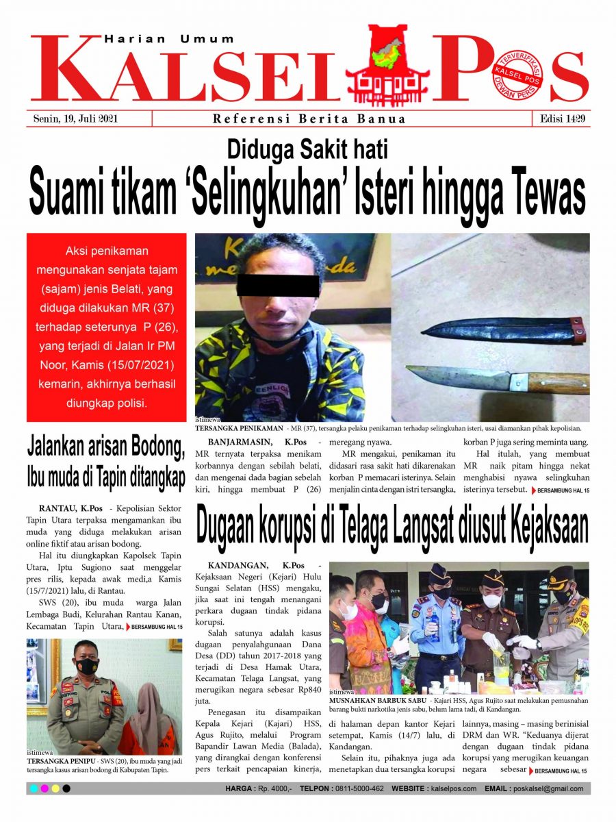 Diduga Sakit hati, Suami tikam ‘Selingkuhan’ Isteri hingga Tewas. Epaper Kalselpos 1429 Edisi Senin 19 Juli 2021