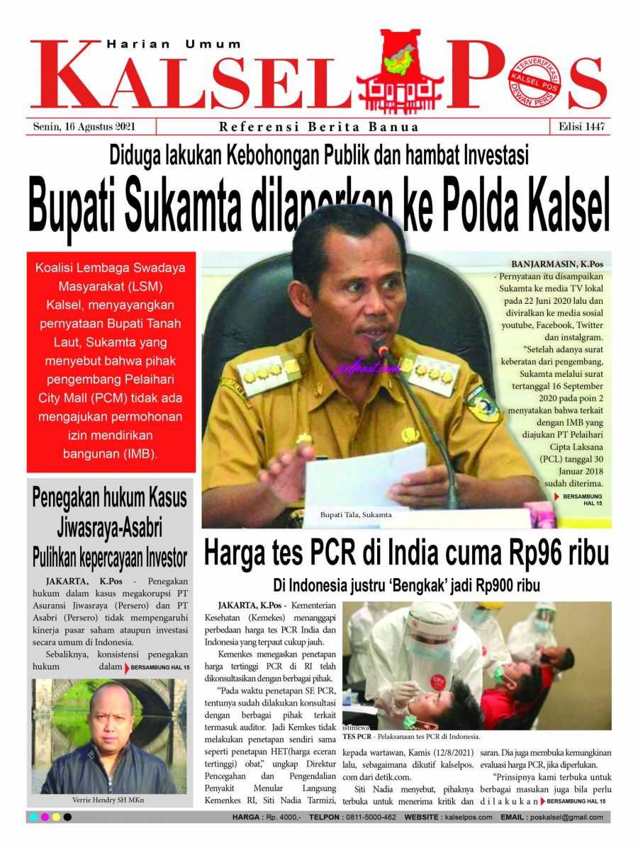 Diduga lakukan Kebohongan Publik dan hambat Investasi, Bupati Sukamta dilaporkan ke Polda Kalsel. Epaper Kalselpos 1447 Edisi Senin 16 Agustus 2021