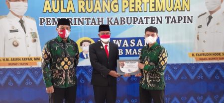 Penyerahan pengahrgaan oleh Ketua Bawaslu Tapin Thessa Aji Budiono diterima langsung oleh Wakil Bupati Tapin H Syafrudin Noor di Aula Pertemuan Sekretariat daerah Kab Tapi Selasa (17/08) usai upacara HUT Kemerdekaan RI ke 76 di Kabupaten Tapin.