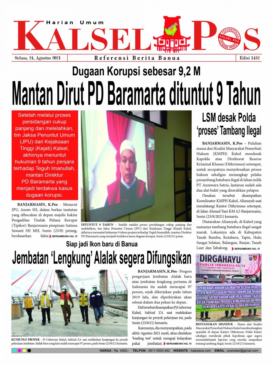 Dugaan Korupsi sebesar 9,2 M, Mantan Dirut PD Baramarta dituntut 9 Tahun . Epaper Kalselpos 1452 Edisi Selasa 24 Agustus 2021