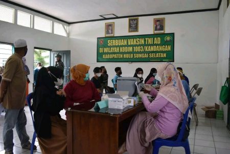 “Vaksinasi digelar sebagai wujud komitmen pemerintah untuk mengatasi pandemi COVID-19. Semoga dengan vaksin immunity tubuh segera terbentuk, sehingga dapat mencegah penularan virus corona, ” ujar Perwira Koordinator Kegiatan Kodim 1003 HSS, Kapten Inf Yus Kristali.