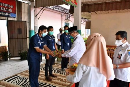 Kandangan,kalselpos.com– Bupati Hulu Sungai Selatan (HSS) Achmad Fikry didampingi Wakil Syamsuri Arsyad memberikan paket bingkisan buah-buahan bagi pasien COVID-19, di ruang Karantina Eks Rumah Sakit Umum Daerah (RSUD) Brigjend Hasan Basry Kandangan, Rabu (25/8).