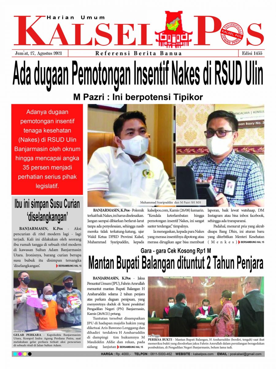 Ada dugaan Pemotongan Insentif Nakes di RSUD Ulin. Epaper Kalselpos 1455 Edisi Jum’at 27 Agustus 2021