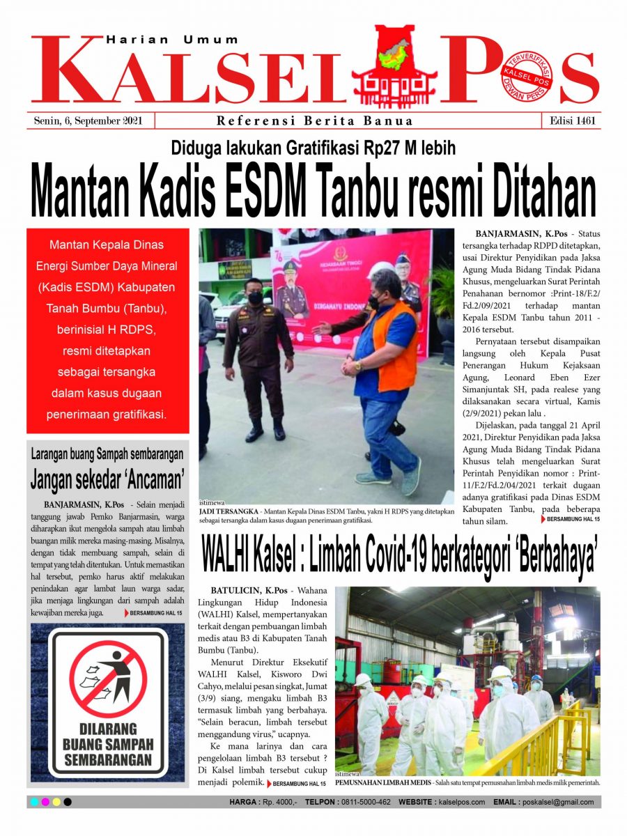 Diduga lakukan Gratifikasi Rp27 M lebih, Mantan Kadis ESDM Tanbu resmi Ditahan. Epaper Kalselpos 1461 Edisi Senin 6 September 2021