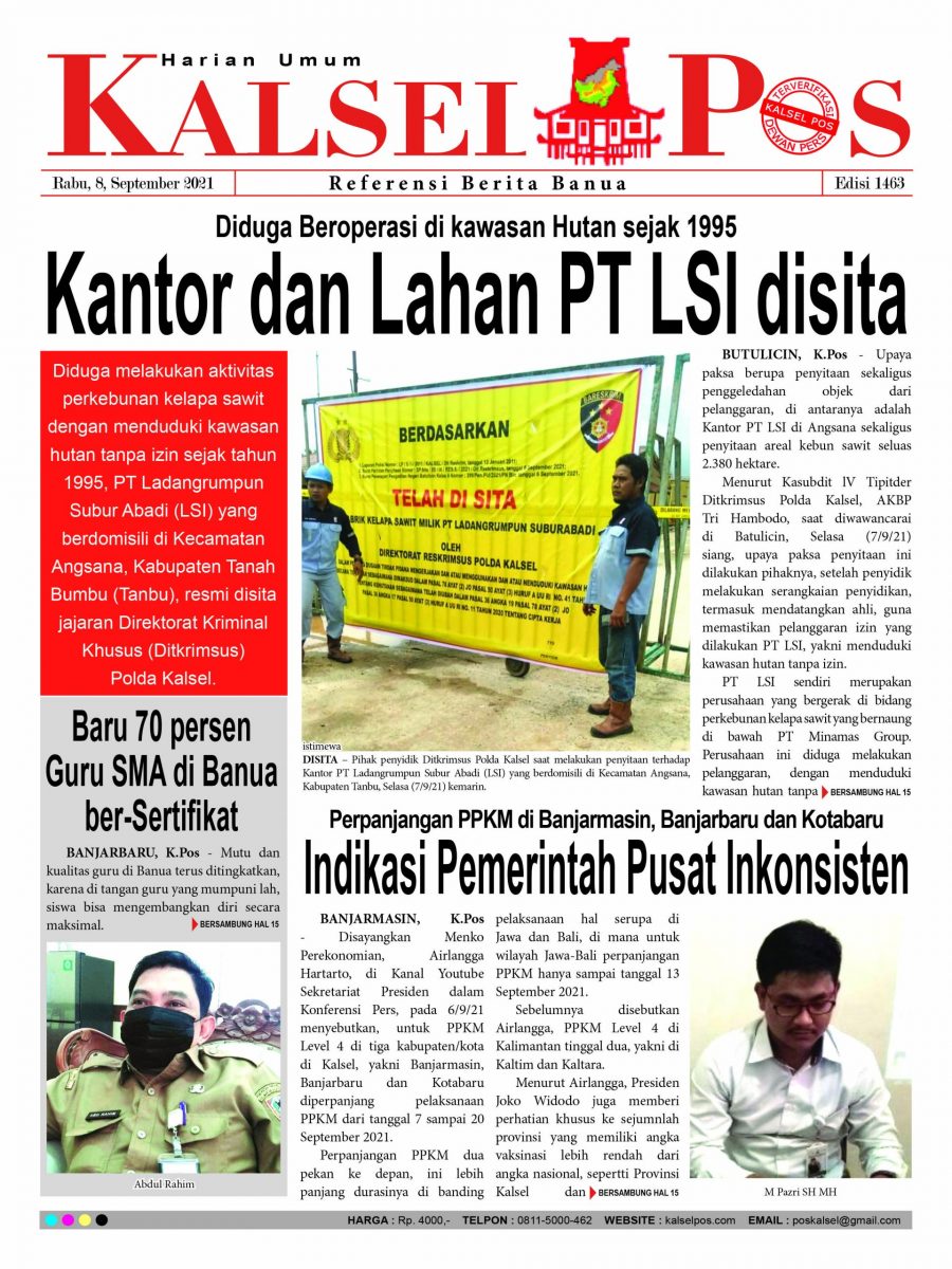 Diduga Beroperasi di kawasan Hutan sejak 1995, Kantor dan Lahan PT LSI disita. Epaper Kalselpos 1463 Edisi Rabu 8 September 2021