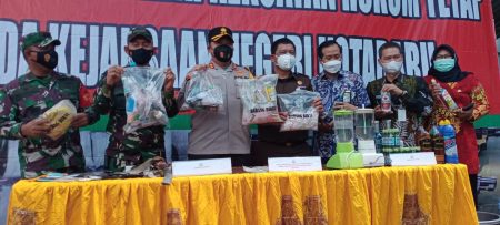 Dari laporan Kasi Barang Bukti dan Barang Rampasan Kejari Kotabaru, Syaiful bahri, barbuk yang dimusnahkan terdiri dari 19,14 gram sabu, 947 butir Pil Zenith, 6.670 butir obat daftar G, senjata tajam, dan barbuk lainnya.