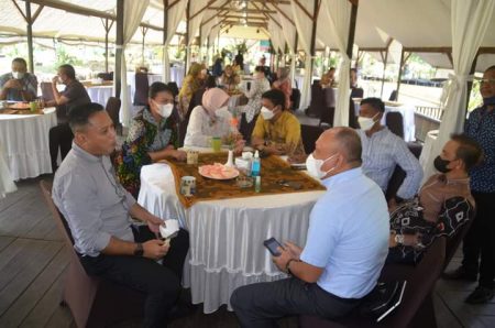 Rakor sekaligus syukuran jajaran forkopimda didampingi para istri/suami atas turunnya status PPKM Batola yang sudah berada di level 2 ini dilaksanakan di Rumah Makan Pawon Tlogo, Kelurahan Handil Bakti Kecamatan Alalak, Batola, Sabtu (25/09/2021).