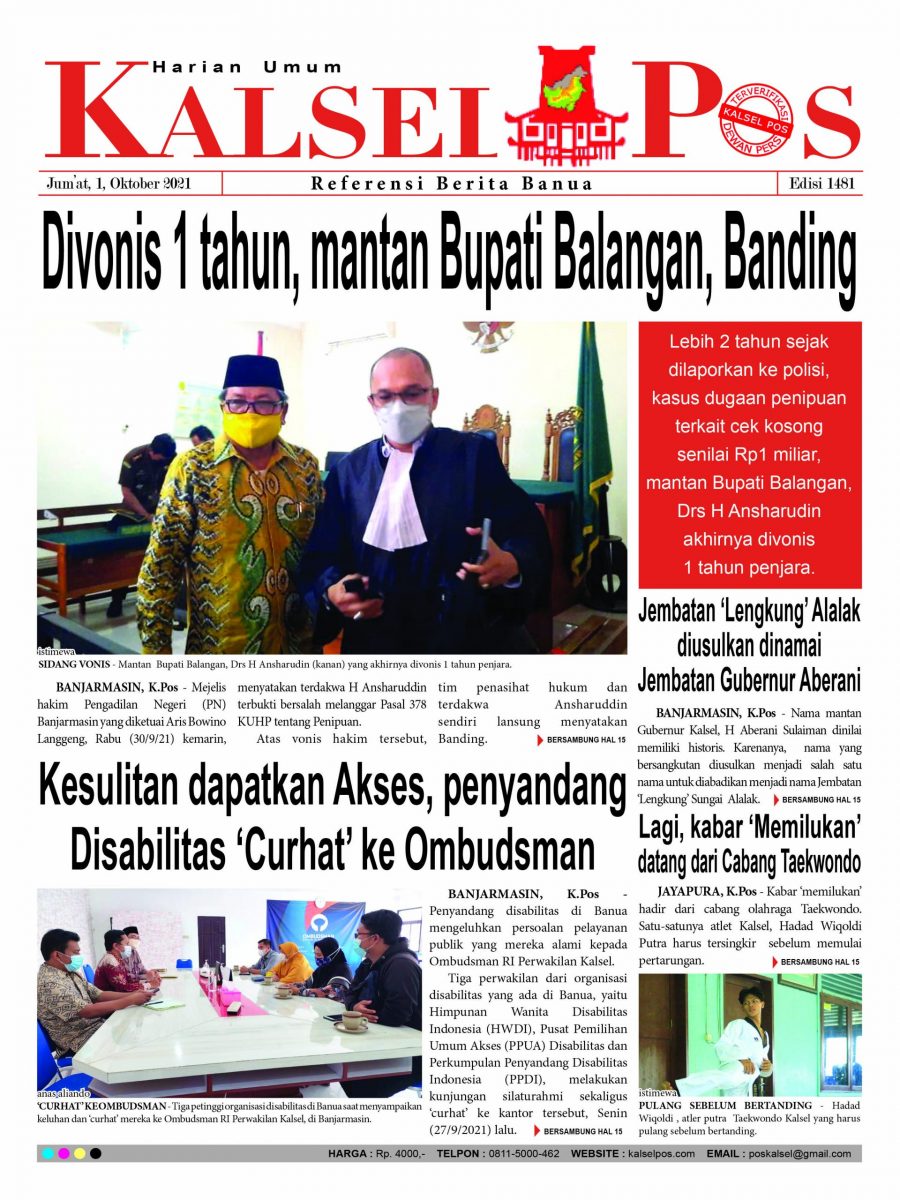 Divonis 1 tahun, mantan Bupati Balangan, Banding. Epaper Kalselpos 1481 Edisi Jum’at 1 Oktober 2021