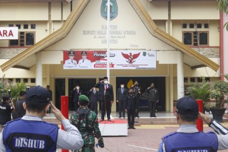 Amuntai,kalselpos.com – Peringati Hari Kesaktian Pancasila 2021, Pemerintah Kabupaten Hulu Sungai Utara (HSU) melaksanakan apel di halaman Sekretariat Daerah setempat, dengan protokol kesehatan diikuti Forkopimda, pejabat pemerintahan, Satpol-PP dan Damkar, Dinas Perhubungan, Kodim 1001 dan Polres HSU.