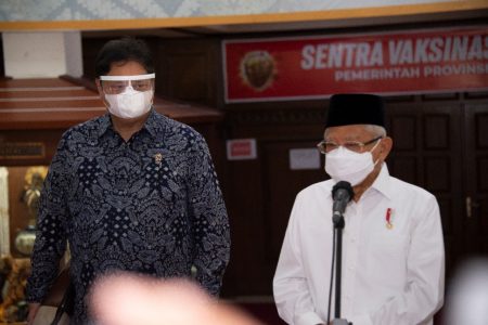Wakil Presiden RI Ma’ruf Amin yang didampingi oleh Menteri Koordinator Bidang Perekonomian Airlangga Hartarto, selaku Ketua Komite Penanganan Covid-19 dan Penanganan Ekonomi Nasional (KPC-PEN), meninjau sentra vaksinasi di Gedung Gradhika Bakti Praja, Kota Semarang, Rabu (7/10).