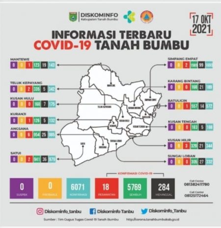 Batulicin, kalselpos.com – Update terakhir perkembangan kasus konfirmasi Covid-19 di Kabupaten Tanah Bumbu (Tanbu), Kalimantan Selatan, Minggu (17/10/2021) pukul 16.00 WITA.