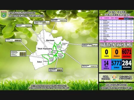 Batulicin, kalselpos.com – Update terakhir perkembangan kasus konfirmasi Covid-19 di Kabupaten Tanah Bumbu (Tanbu), Minggu (24/10/2021), pada pukul 16.00 WITA, menyebutkan