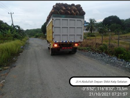 KOTABARU, kalselpos.com – Aktivitas truk pengangkut tandan buah segar (TBS) kelapa sawit yang melintas di jalan umum, di wilayah Kelumpang Selatan masih kerap dilakukan.