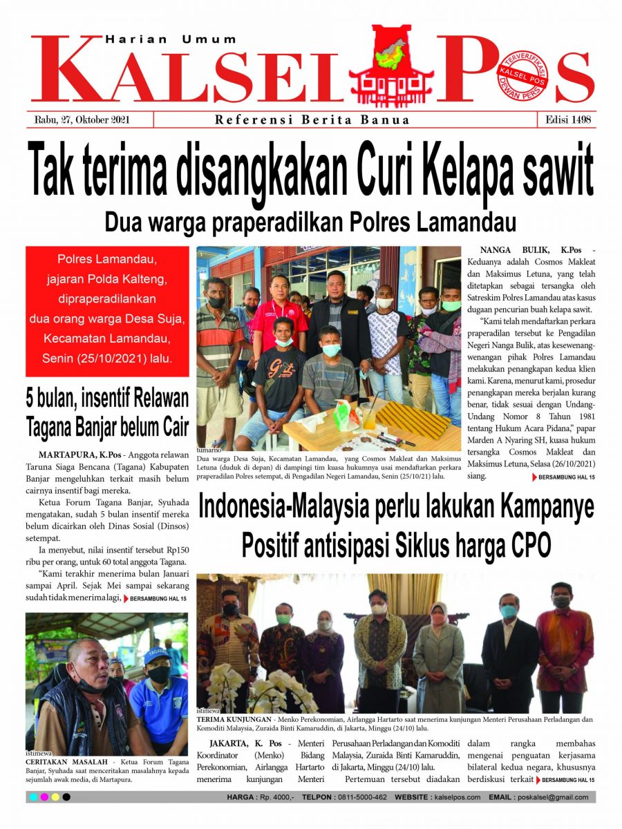Tak terima disangkakan Curi Kelapa sawit, Dua warga praperadilkan Polres Lamandau. Epaper Kalselpos 1498 Edisi Rabu 27 Oktober 2021 Zainal27 Oktober 202124 Desember 20251,653 views Halaman: 1 2 3 4 5 6 7 8 9 10 11 12 13 14 15 16 Pos terkaitTerkait Korupsi Dana Desa Rp657 juta, Eks Kades di Kusan Hilir divonis 3 TahunDireksi baru PAM Bandarmasih terbentuk, Zulbadi dipercaya jadi DirutParkir Pasar Wadai ‘mencekik’, Pengendara Motor ditagih Rp10 Ribu