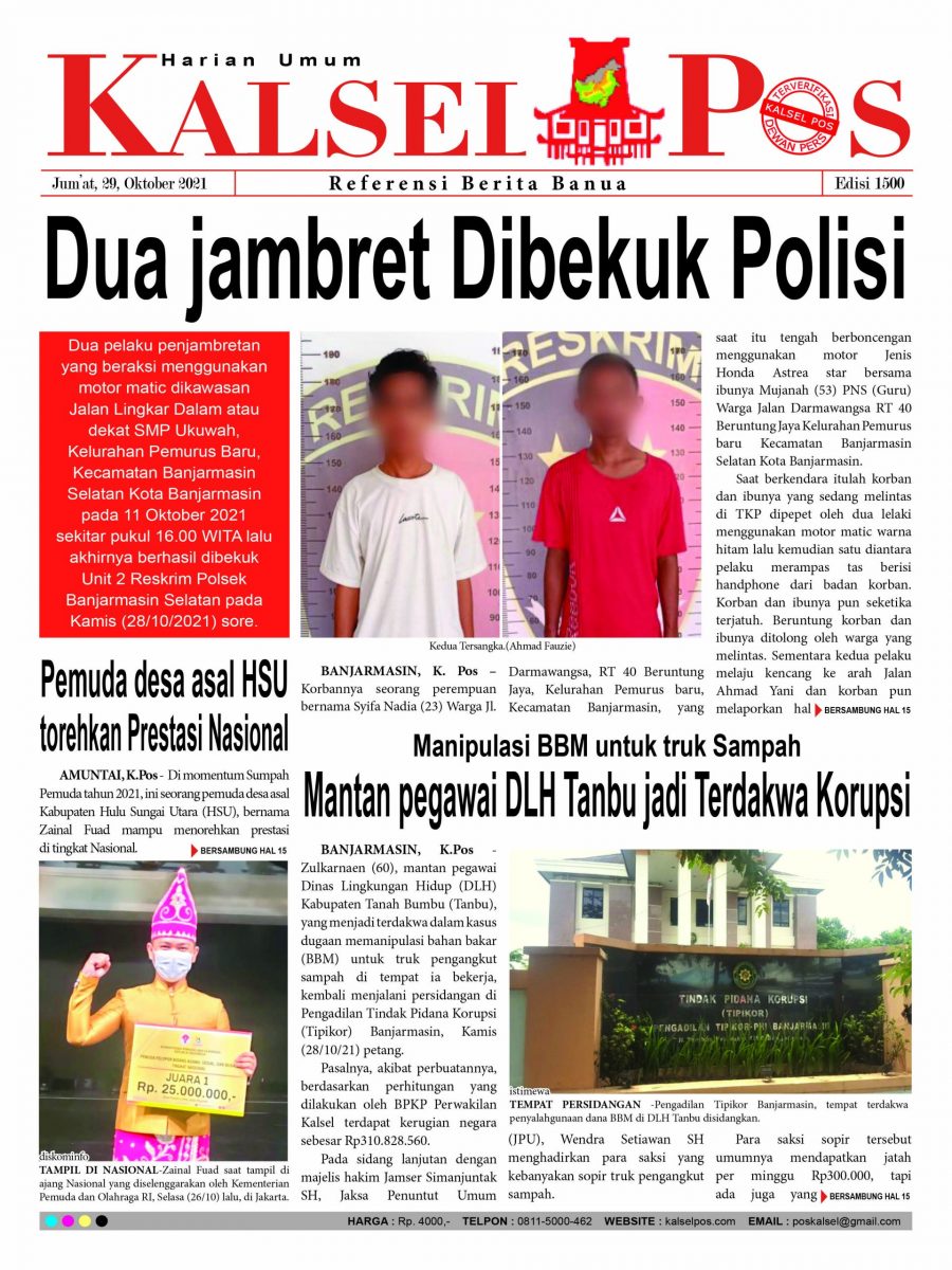 Dua jambret Dibekuk Polisi. Epaper Kalselpos 1500 Edisi Jum’at 29 Oktober 2021 Zainal29 Oktober 20211,714 views Halaman: 1 2 3 4 5 6 7 8 9 10 11 12 13 14 15 16 Pos terkaitTerkait Korupsi Dana Desa Rp657 juta, Eks Kades di Kusan Hilir divonis 3 TahunDireksi baru PAM Bandarmasih terbentuk, Zulbadi dipercaya jadi DirutParkir Pasar Wadai ‘mencekik’, Pengendara Motor ditagih Rp10 Ribu