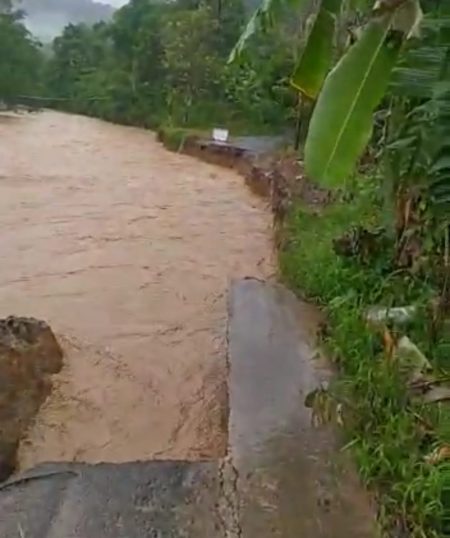 Kandangan,kalselpos.com – Hujan lebat yang mengguyur Pengunungan Meratus mengakibatkan akses jalan Desa Ulang, Kecamatan Loksado putus tidak bisa dilalui, Minggu (28/11). Jalan tersebut putus akibat tergerus arus Sungai Amandit yang deras, sehingga jalan desa yang berada dibibir sungai longsor.