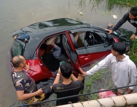Sebuah sedan berwarna merah dan bagian atas hitam, dengan nomor polisi (nopol) DA 1201 LF tercebur ke sungai dalam keadaan terbalik pada sisi kiri jalan Pelaihari-Bati-Bati.