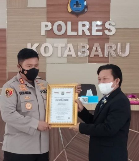 KOTABARU, kalselpos.com – Pemberian penghargaan presisi AWARD dari Lembaga Kajian Strategis Kepolisian Indonesia (LEMKAPI ) kepada Polres Kotabaru atas respon cepat dalam menindak lanjuti informasi dari masyarakat tentang pinjaman online ilegal, di Aula SS Polres Kotabaru, Senin (29/11/2021).