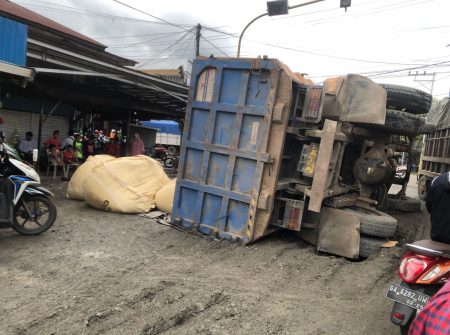 Namun naas, saat berada di lampu merah Palampitan Hilir, truk yang diduga bermuatan semen milik PT Couch itu terbalik, menyusul bahu jalan, tempat di mana ban kiri truk berada, tak sanggup menahan beban, hingga amblas.