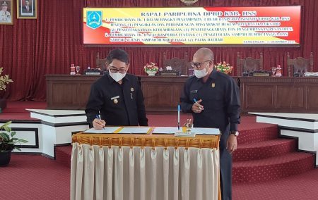 Kandangan, kalselpos.com – Dewan Perwakilan Rakyat Daerah (DPRD) Hulu Sungai Selatan (HSS) menetapkan dua rancangan peraturan daerah (ranperda) menjadi peraturan daerah (perda), Rabu (15/12) dalam rapat paripurna yang dipimpin Wakil Ketua II DPRD HSS Muhammad Kusasi.