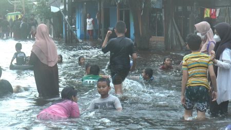 “Jalanan yang terendam banjir ini seperti objek wisata dadakan bagi warga di setiap sore hari,” Salah satu warga, Nurhayati.