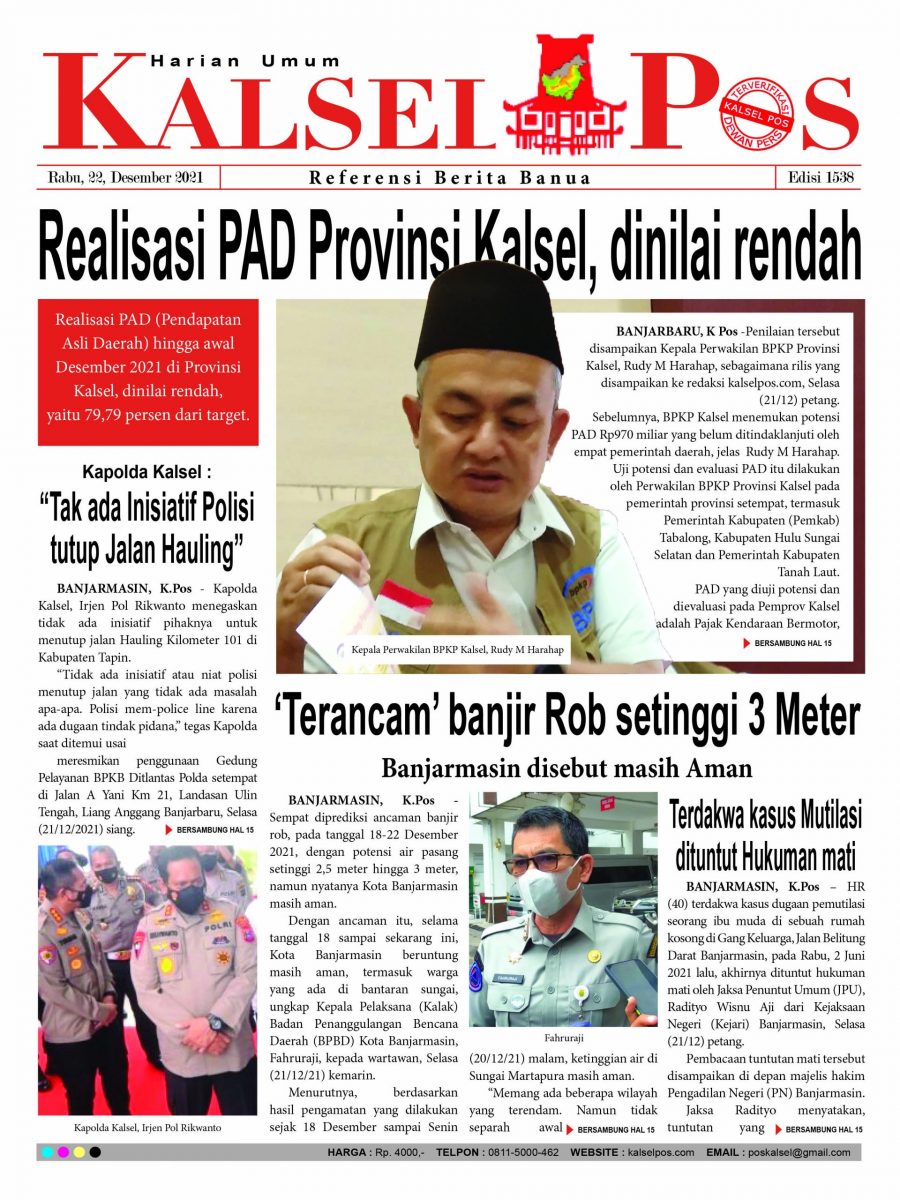 Realisasi PAD Provinsi Kalsel, dinilai rendah.Epaper Kalselpos 1538 Zainal22 Desember 2021243 views Kalsel Pos Berita Terkini, Kabar Terbaru Hari ini Banjarmasin Kalimantan Selatan dan NasionalBacaan LainnyaTerkait Korupsi Dana Desa Rp657 juta, Eks Kades di Kusan Hilir divonis 3 TahunDireksi baru PAM Bandarmasih terbentuk, Zulbadi dipercaya jadi DirutParkir Pasar Wadai ‘mencekik’, Pengendara Motor ditagih Rp10 Ribu Download aplikasi kalselpos.com versi android kami di Play Store : Aplikasi Kalselpos.com Pos terkaitTerkait Korupsi Dana Desa Rp657 juta, Eks Kades di Kusan Hilir divonis 3 TahunDireksi baru PAM Bandarmasih terbentuk, Zulbadi dipercaya jadi DirutParkir Pasar Wadai ‘mencekik’, Pengendara Motor ditagih Rp10 Ribu