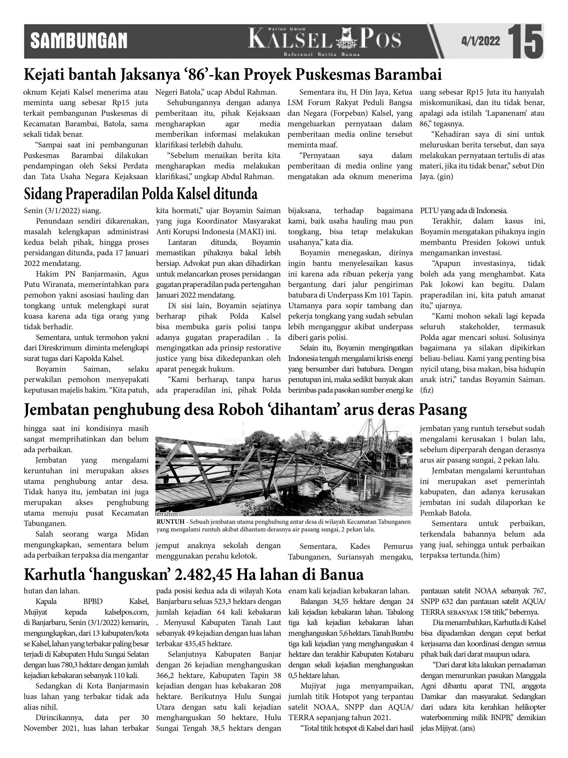 Kejati bantah Jaksanya ’86’-kan Proyek Puskesmas Barambai. – Epaper Kalselpos 1547 kalselpos4 Januari 202224 Desember 2025290 views Kalsel Pos Berita Terkini, Kabar Terbaru Hari ini Banjarmasin Kalimantan Selatan dan Nasional Pos terkaitKUHP baru Lebih Untungkan Terdakwa, PN Barabai terapkan di Kasus PenganiayaanSampah Besar kiriman Hulu di Sungai Martapura, Berpotensi ‘hantam’ Jembatan67 ribu warga Terancam tak Terlindungi JKN