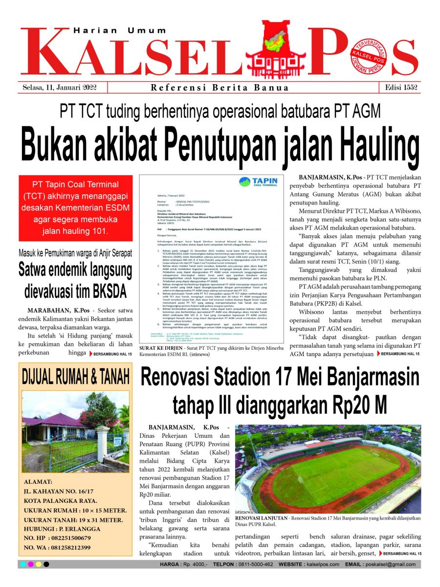 PT TCT tuding berhentinya operasional batubara PT AGM, Bukan akibat Penutupan jalan Hauling. – Epaper Kalselpos 1552 kalselpos11 Januari 202224 Desember 2025186 views Kalsel Pos Berita Terkini, Kabar Terbaru Hari ini Banjarmasin Kalimantan Selatan dan Nasional Pos terkaitTerkait Korupsi Dana Desa Rp657 juta, Eks Kades di Kusan Hilir divonis 3 TahunDireksi baru PAM Bandarmasih terbentuk, Zulbadi dipercaya jadi DirutParkir Pasar Wadai ‘mencekik’, Pengendara Motor ditagih Rp10 Ribu