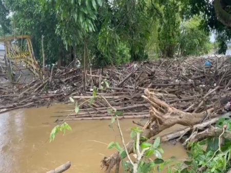 Saai ini, jembatan desa pingaran yang terputus dihantam tumpukan sampah menjadi tontonan warga sekitar. Warga berdatangan menyaksikan material jembatan hanyut terbawa arus bersama tumpukan sampah dan bambu.