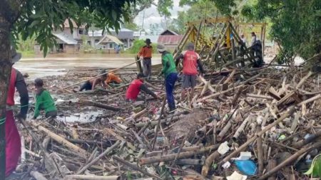 Martapura, kalselpos.com – Jembatan Desa Pingaran Ilir, Kecamatan Astambul, Kabupaten Banjar yang terputus akibat dihantam tumpukan sampah dan bambu, minggu (16/01) siang dibongkar oleh petugas Dinas PUPR bersama warga.