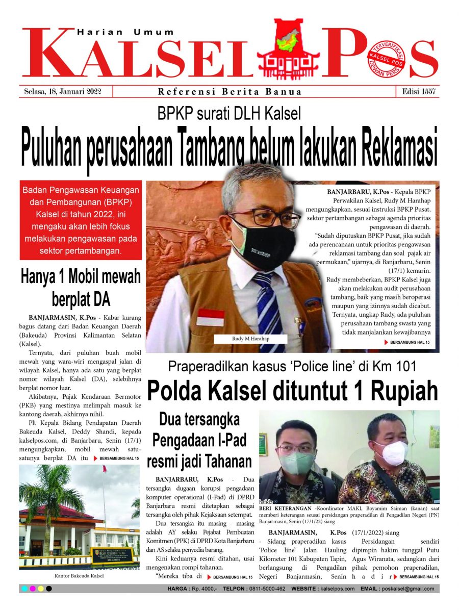 Puluhan perusahaan Tambang belum lakukan Reklamasi. – Epaper Kalselpos 1557 kalselpos18 Januari 202224 Desember 202597 views Kalsel Pos Berita Terkini, Kabar Terbaru Hari ini Banjarmasin Kalimantan Selatan dan Nasional Pos terkaitKUHP baru Lebih Untungkan Terdakwa, PN Barabai terapkan di Kasus PenganiayaanSampah Besar kiriman Hulu di Sungai Martapura, Berpotensi ‘hantam’ Jembatan67 ribu warga Terancam tak Terlindungi JKN