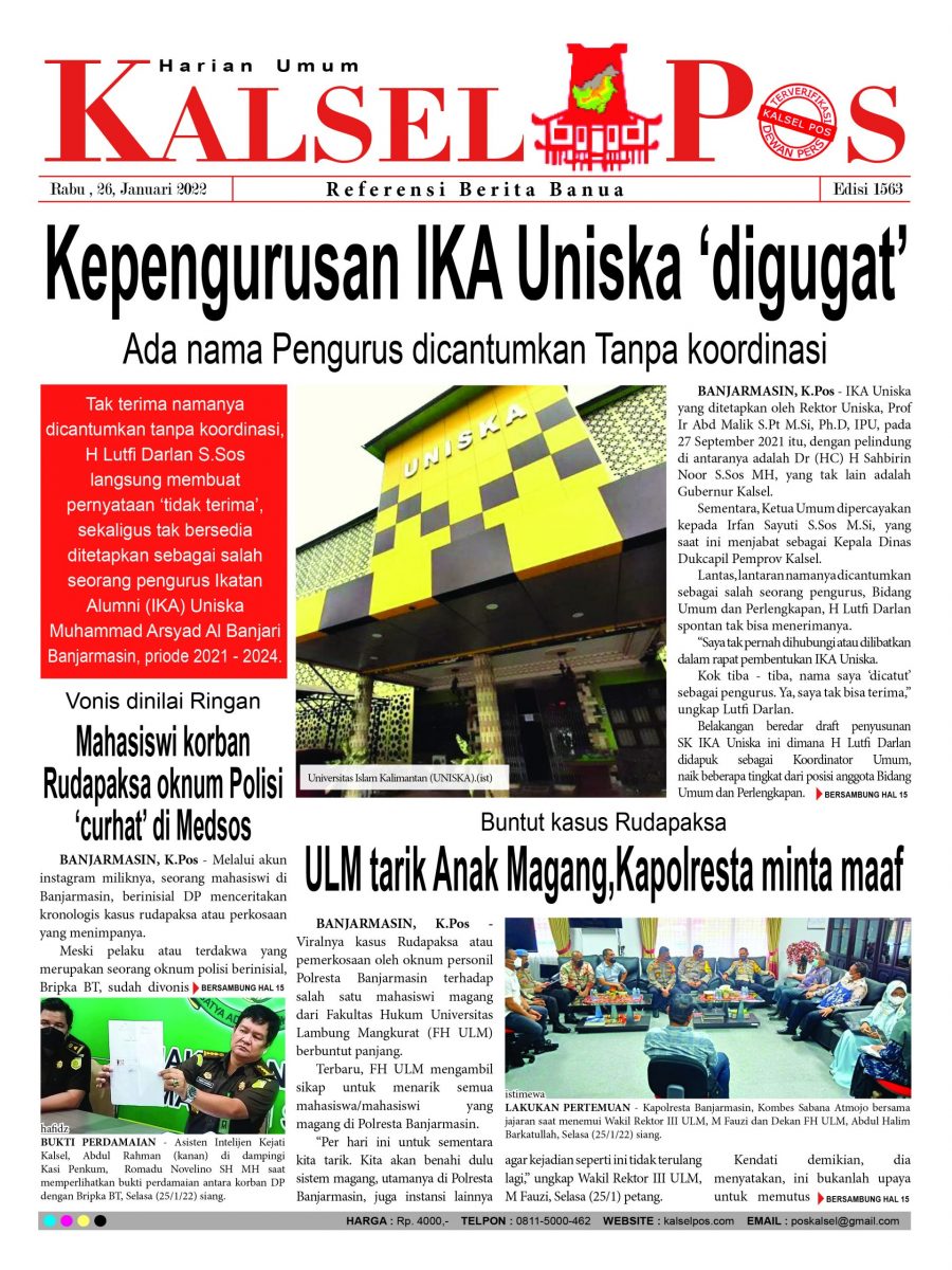 Kepengurusan IKA Uniska ‘digugat’. – Epaper Kalselpos 1563 kalselpos26 Januari 202224 Desember 2025246 views Kalsel Pos Berita Terkini, Kabar Terbaru Hari ini Banjarmasin Kalimantan Selatan dan Nasional Pos terkaitTerkait Korupsi Dana Desa Rp657 juta, Eks Kades di Kusan Hilir divonis 3 TahunDireksi baru PAM Bandarmasih terbentuk, Zulbadi dipercaya jadi DirutParkir Pasar Wadai ‘mencekik’, Pengendara Motor ditagih Rp10 Ribu