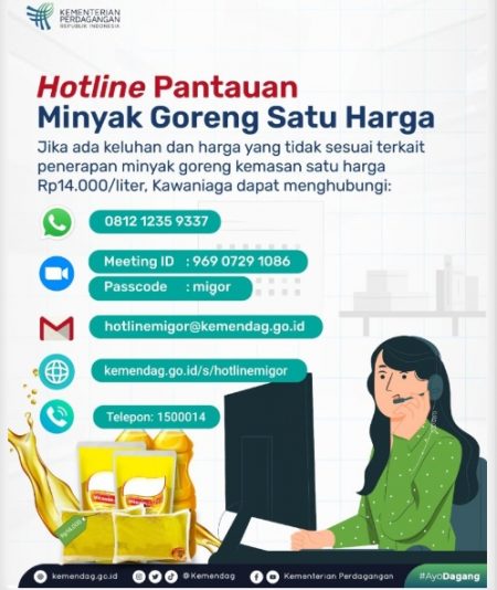 Pada laman tersebut, menyebutkan, untuk pelaksanaannya Kemendag meluncurkan hotline pantauan minyak goreng satu harga apabila ada keluhan maupun kondisi harga yang tidak sesuai dengan yang telah ditetapkan.