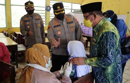 Sebelum mengikuti vitcon arahan dari Kapolri Kapolres AKBP M Gafur Aditya Siregar bersama Bupati H Sayed Jafar menyempatkan diri melihat dan meninjau langsung pelaksanaan vaksinasi bagi anak-anak diruang kelas MTSN 1 Kotabaru.
