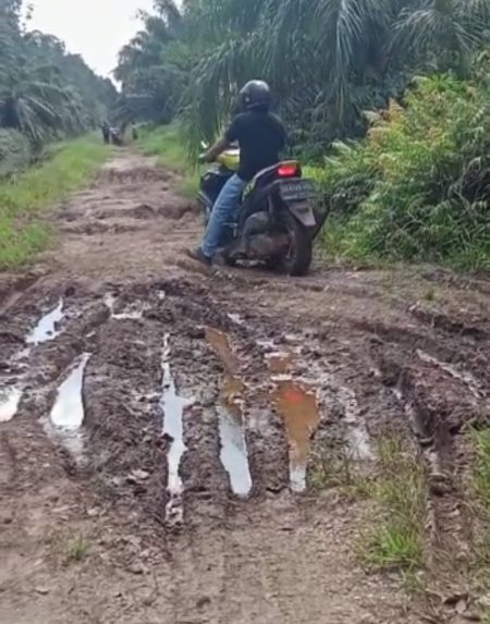 Jalan ini sebelumnya sudah dilakukan pengerasan pada tahun 2016 lalu, namun pada tahun 2017 jalan ini dikeruk oleh pihak perusahaan perkebunan kelapa sawit, sehingga kondisi jalan jadi sangat becek dan berlumpur jika hujan.