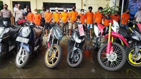 Dalam konferensi pers di halaman Mapolresta Banjarmasin, Kamis (24/2/22) siang, sebanyak 15 orang tersangka pelaku curanmor juga ikut dihadirkan, lengkap dengan barang bukti kejahatan mereka.