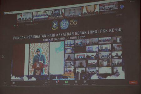 Kotabaru, kalselpos.com – Ketua Tim Penggerak Pemberdayaan dan Kesejahteraan Keluarga (TP-PKK) Kabupaten Kotabaru Hj Fatma Idiana Sayed Jafar bersama dengan anggotanya mengikuti Peringatan Hari Kesatuan Gerak (HKG) Pemberdayaan Kesejahteraan Keluarga (PKK) Tingkat Nasional ke-50 tahun 2022 secara virtual yang bertempat di Operation Room Sekda, Selasa (8/3/2022).