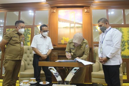 Marabahan, kalselpos.com– Bupati Barito Kuala Hj. Noormiliyani AS terima kunjungan Kementrian Pekerjaan Umum dan Perumahan Rakyat (Kemen PUPR RI). Kunjungan ini dalam rangka penandatanganan Berita Acara Serah Terima (BAST) dan Naskah Hibah Barang Milik Negara (BMN) dari Kemen PUPR RI kepada Pemerintah Kabupaten Barito Kuala (Batola), Selasa (29/3).